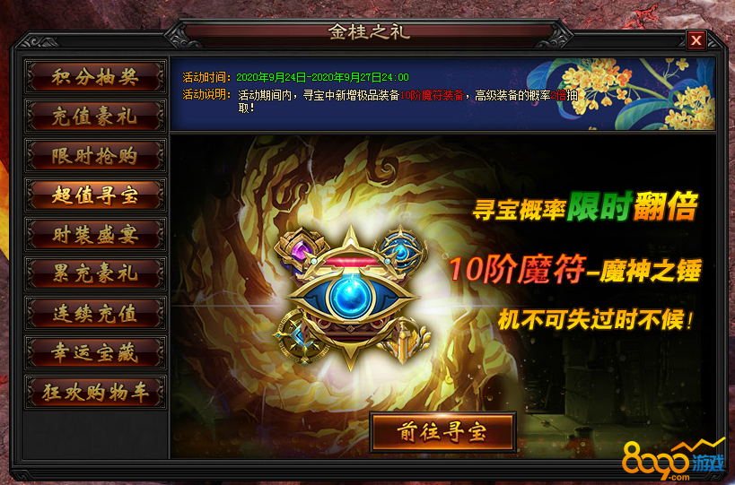 4.2 活动期间内,寻宝中新增魔符装备,并且高级装备的概率双倍抽取