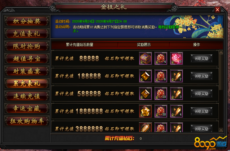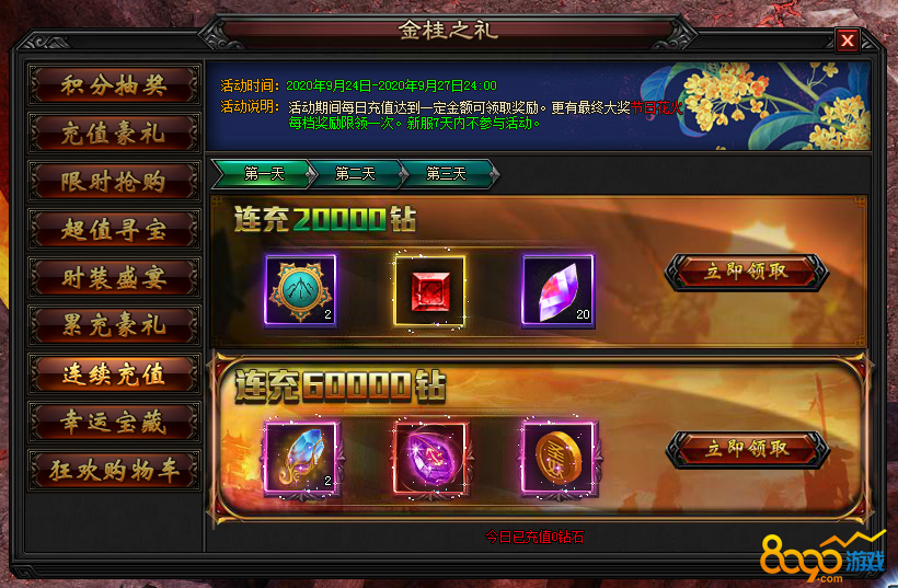 2.2 活动期间内,每日充值达指定钻石数额,即可领取充值奖励,可原每日充值奖励叠加领取