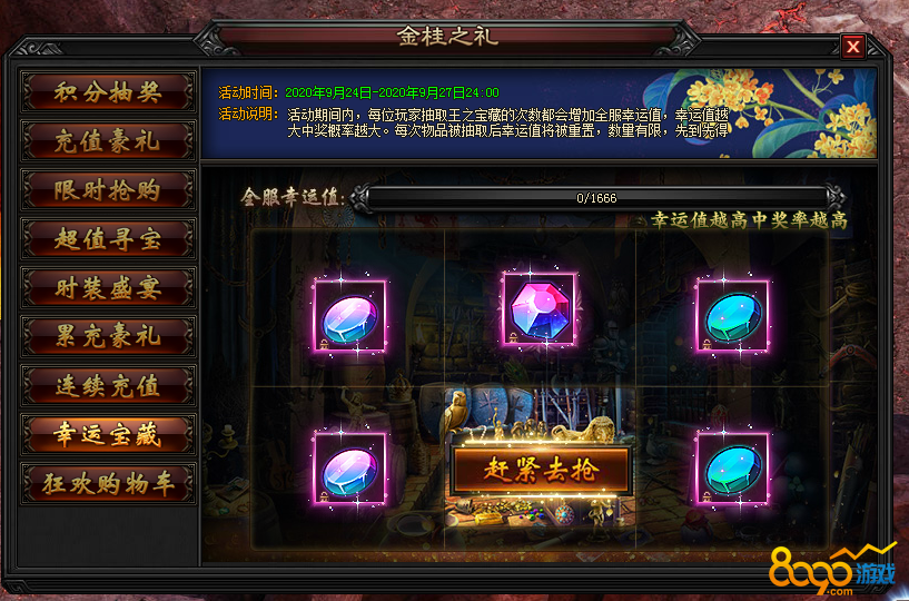 7.1 活动期间内,全服玩家在抽取王之宝藏的时候都会增加全服幸运值