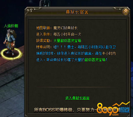 人族奸细每隔五小时可放玩家进入“典狱长宿舍”挑战终极Boss典狱长