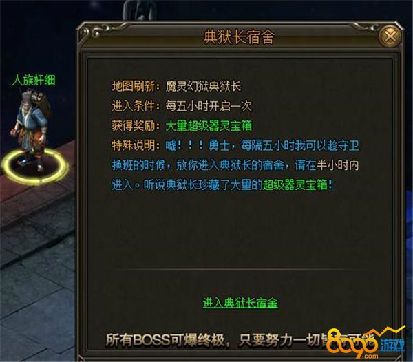 “典狱长宿舍”每次开启时系统会进行公告,此时玩家可通过“人族奸细”进入“典狱长宿舍”击败典狱长,会掉落大量“超级器灵宝箱”。