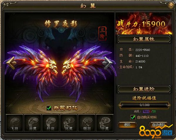 翅膀系统是一个非常强大的系统,升级的时候有着大量属性获得。而且外形会不停的变化,变的越来越酷炫。