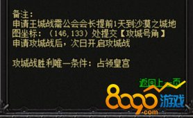 守城方必须保护皇宫不被占领,若皇宫被占领则守城失败,守城方将立即失去王城头衔。另外,公会会长可在英雄城“战神雕像”处,,领取攻城战元宝奖励,时间为当天的22:00-23:59。