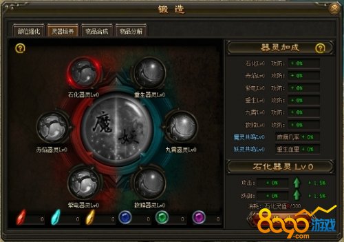 达到开放条件后,玩家可从“锻造-器灵培养”处打开界面。使用器灵材料可增加对应器灵的“灵值”消耗灵值,提升对应器灵的等级。
