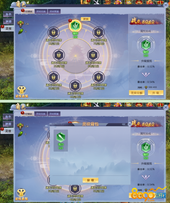 镶嵌的灵纹可以进行升级,升级材料从灵纹塔中获得。升级可以提升战力和属性。身上镶嵌的灵纹等级达到一定程度还能激活灵纹套装。