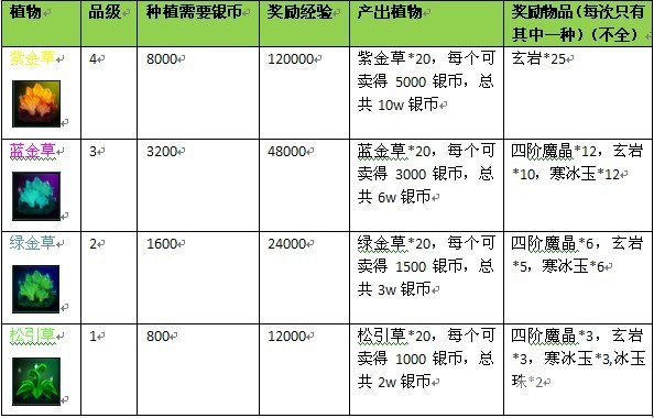 首先先说一下大家最关心的产出问题。《异界逍遥》的药园,可以种植以下几种植物,它们对应的产出如下表: