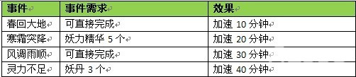 种植系统右边的事件随着时间进行刷新,效果是免费增加植物生长速度。有些时间是可以直接完成的,有些则需要一些材料,如妖力精华、妖丹进行辅助。平时大家可以去收集多点这些材料,以防备用。