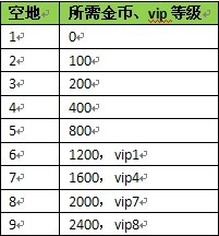 最后说说开垦空地的花费。游戏总共可开垦9块地,开启种植系统时有1块地,每开垦一块地,需要花费一定的金券/币。6块地以上就需要相应的vip等级才能开启了。