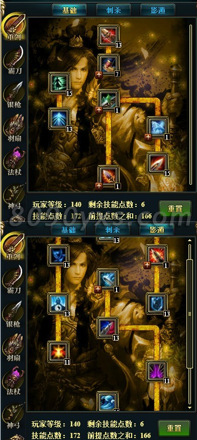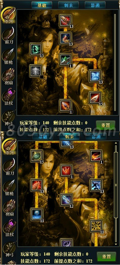 刺杀系作为单挑比较给力的职业,以高重击高闪避为主,请看加点(PS:可从冰封剑或是疾飞燕技能中挤出6点技能点点130技能)