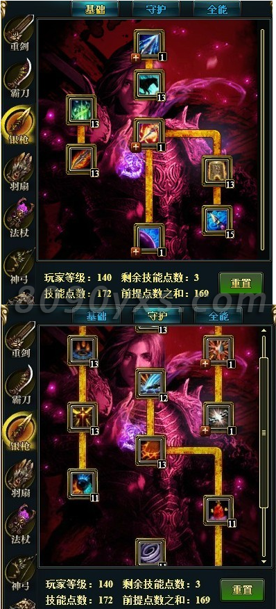相对而言,以前是比较冷门的职业,但是我想说的一点是,守护银枪的春天已经来到:变态的高防御+不弱于全能的攻击数值and也会拉BOSS也会给队友上高防状态+缴械技能,这样的一个职业在后期不论是刷副本还是打架都会是个非常给力的角色,单攻基础如果要加满的玩家可不加群攻改加单攻基础,附文字加点: