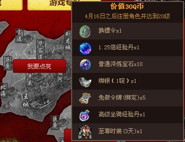 2.开州点亮:随便一个QQ号在2013.4.16—2013.5.15期间任意区创建一个号(练到20级,1个小时,10级秒答题,15级秒温泉)然后点我要点亮(用这个20级的号所在区服角色)获得一枚激活码,然后在CDK兑换中心 选择你老区的区 服和角色名,激活即可。
