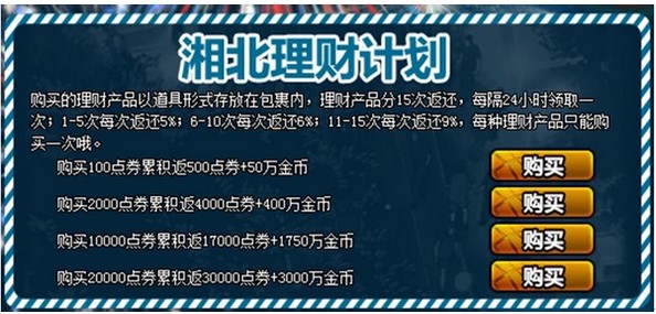 活动内容:用户可前往“湘北理财祭典活动”购买理财,购买的理财以道具形式存放在包裹内,理财分15次返还,每隔24小时领取一次;1-5次每次返还5%;6-10次每次返还6%;11-15次每次返还9%,每种理财只能购买一次哦。