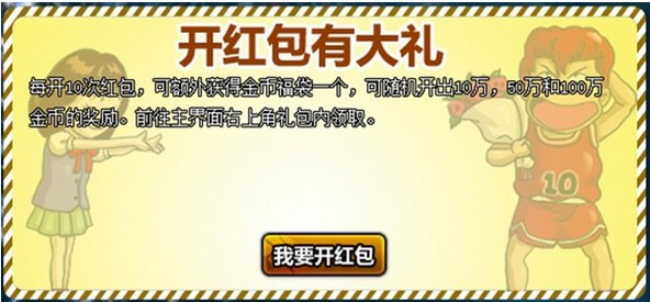 活动内容:活动期间,每开启10次红包,就可以获得金币福袋1个,金币福袋开启后随机获得金币10万、50万、100万其中一种。