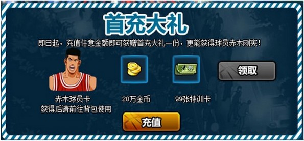 首充礼包内容:赤木球员卡(使用后提升赤木友好度至满,可直接招募)、20万金币、99张特训卡。球员赤木的招募权,需要剧情模式通关至第三章第二节,才能开启。