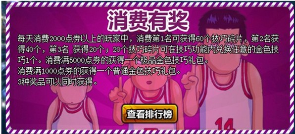 活动内容:活动期间,每天消费榜前三名的玩家,将获得超值技巧大礼包;同时,消费达到一定数额的玩家,也可获得各种好礼。排名奖励:每天消费2000点券以上的玩家中,消费第1名可获得60个技巧碎片,第2名获得40个,第3名获得20个;20个技巧碎片可在技巧功能内兑换任意的金色技巧1个。