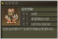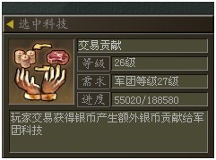 升级军团到50,可以研究贸易贡献,该科技产生额外的贸易银币贡献给军团科技。