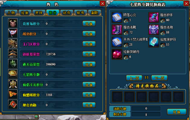 【角色界面】-【积分】分页 - 【七星阵令牌兑换商店】,现在可用七星阵令牌兑换天书神技。