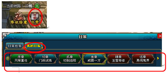 1、在游戏界面右上角点击“日常”图标,选择“我的目标”界面,完成章节中的相应任务,即可领取当前章节的奖励。