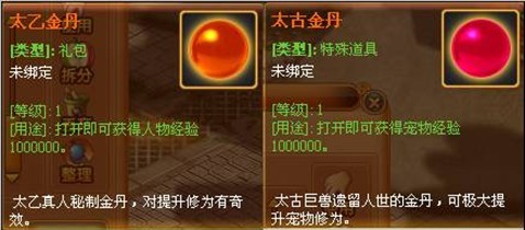 太乙金丹和太古金丹展示:使用方法仅需在包裹中双击即可。