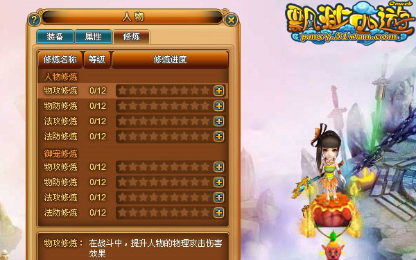 为满足群众日益高涨的呼声,《飘渺西游》的修炼系统应运而生。当玩家等级提升至40级后,人物面板里的“修炼”面板将被激活,这时玩家就可以根据各自不同的需求提升各项能力。初始上限为6级,此后等级每提升5级可提升一级修炼上限。修炼内容包括“物攻修炼”、“物防修炼”、“法攻修炼”、“法防修炼”。至于如何提升修炼等级,玩家进入修炼面板时,点选“帮助”便可一目了然。