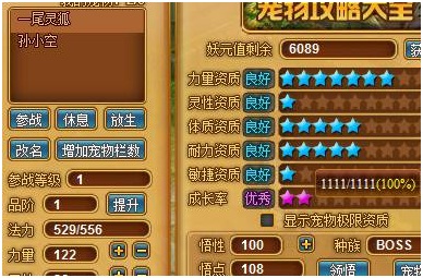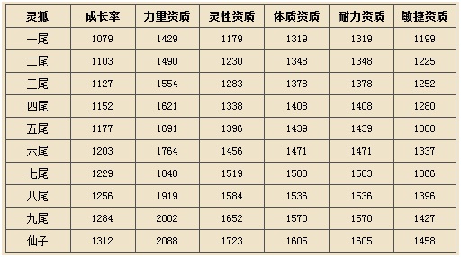 上表是各阶段变异灵狐的资质,极限资质需在此基础上乘以1.03;方便大家在洗宠物时参照