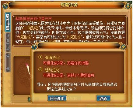 进化规则:灵狐从20级开始,包括20级,每升10级可进化一次;进化分为【普通进化】和【越阶进化】;普通进化一次可提升一条 尾巴,越阶进化一次可提升两条尾巴;当进化到八尾或九尾时,可进化至灵狐仙子。普通进化不需要消耗任何东西;越阶进化,第一次需消耗1个【涅槃仙丹】,第 二次需消耗5个【涅槃仙丹】,第三次需消耗20个【涅槃仙丹】,第四次需消耗50个【涅槃仙丹】,从八尾或从九尾进化到灵狐仙子时,固定消耗100个【涅 槃仙丹】。