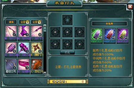 打孔规则:装备打孔需要打孔符,高级的打孔符可以打造更多的孔洞。