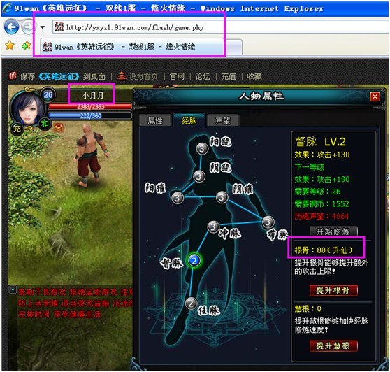 游戏截图一张(截图中必须清晰显示玩家角色名、经脉根骨、浏览器地址)