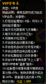 活动内容:在活动期间内,使用Vip半年卡、Vip季卡、Vip月卡、VIP周卡成为Vip身份后可获【VIP礼包】奖励。