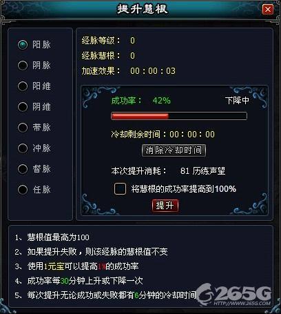 在《英雄远征》中人物经过经脉修炼和提升根骨之后,等级达到30级就可以提升慧根,点击需要提升慧根的经脉,再点击提升即可进行“提升慧根”,你将能够大幅加快经脉修炼速度,变得快人一等!不过在“提升慧根”之前,请先牢记以下几点:慧根值最高为100,每次提升1;如果提升失败,则该经脉的慧根值不变;使用1元宝可以提高1%的成功率;成功率每30分钟上升或下降一次;每次提升无论成功或失败都有6分钟的冷却时间; “提升慧根”需要消耗历练声望。