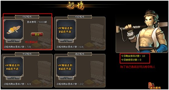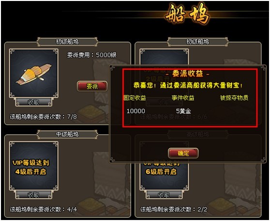 船坞总共有4个船位,随着VIP等级开放、官阶等级要求开放。每个船位可能出现的船的各个级别的概率不同,分高级船位、中级船坞、初级船坞。