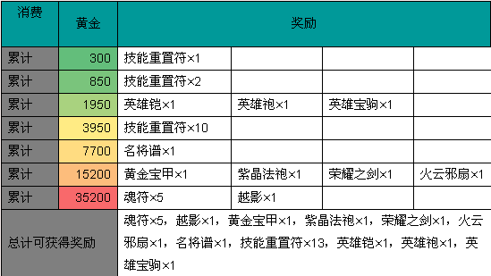 2.玩家消费累计达到奖励档金额,即可领取对应档奖励。一共七档奖励,每档奖励只可领取一次,最多可领取七档奖励。例:玩家累计消费35200黄金,可领取全部7档奖励各一份。