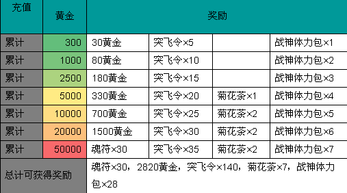 2.玩家充值累计达到奖励档金额,即可领取对应档奖励。一共七档奖励,每档奖励只可领取一次,最多可领取七档奖励。例:玩家累计充值50000黄金,可领取全部7档奖励各一份。