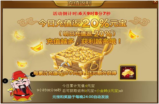 1、 在活动期间,充值元宝可返回相应比例的不绑定元宝优惠(注:返还的比例每天各有不同,另外:如果返还元宝数有小数点,即向上取整,例:充值31元宝*20%=6.2,那么返还7元宝)