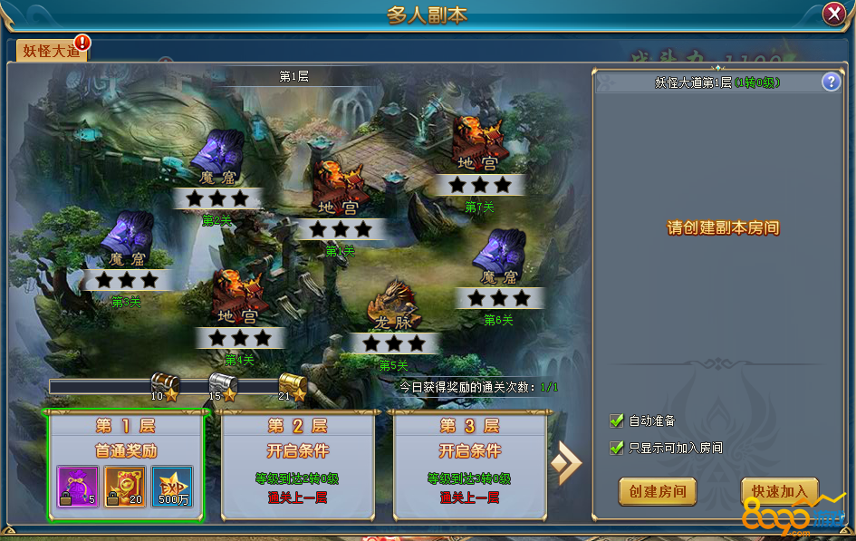 2、每一关副本,需要玩家达到相应的等级才能进行挑战,玩家可组三人队伍前往挑战。
