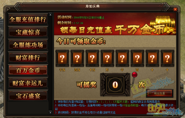 活动详情:活动期间充值领取每日充值5档奖励,分别可获得4、1、1、1、1次摇杆次数,摇杆的次数会从低到高显示,每日充值的档次后面一档都会高出前面10倍金币收益,如果一天5档的领完就可获得当天金币的最大收益,获得的金币将在每日0点通过邮件的方式发送给玩家。