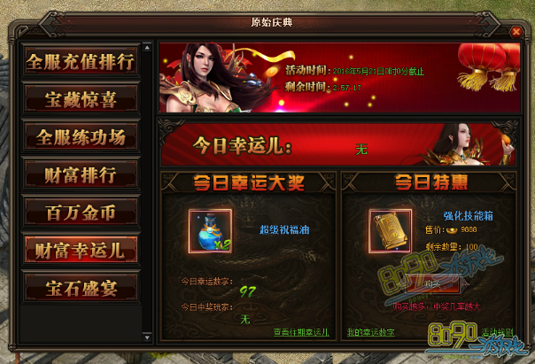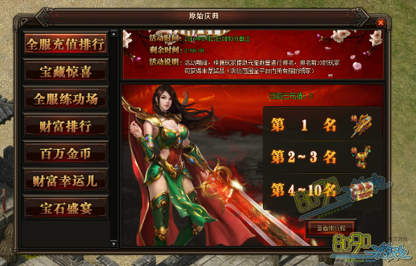 活动详情:活动期间系统会根据玩家提取的元宝数量来进行排名,此活动是按照全服的充值榜来算的,奖品会在活动结束后次日通过邮件发放给玩家。