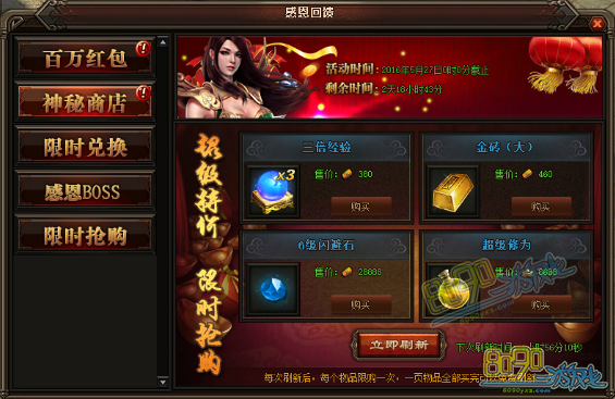 活动详情:家最期待的神秘商店又来了哦,小伙伴们可以已使用金币、礼金、元宝在神秘商店内购买所需道具,只要399元宝就可以进行刷新,每样只能购买一次,如果这一页的购买完了可以免费刷新一次。