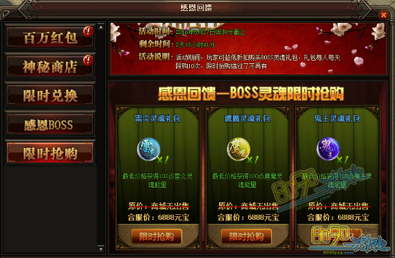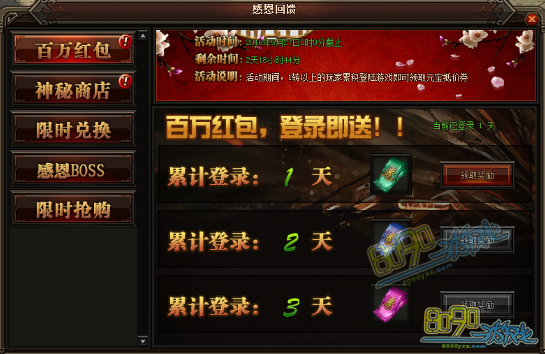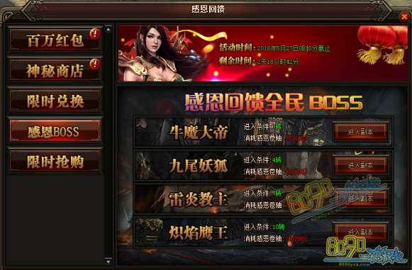活动详情:活动期间玩家可在挂机地图里打小怪来获得感恩卷轴,例如祖玛寺庙、赤月峡谷、牛魔寺庙、魔龙城、狐月山谷、冰晶神殿、雷炎魔窟、苍月岛等都可以获得感恩卷轴,玩家获得感恩卷轴后可消耗相应卷轴进入副本,副本要求等级为1转、4转、7转、10转、想对应消耗的卷轴为100卷轴、100卷轴、100卷轴、200卷轴。BOSS会随机爆出2、4、6、8转装备不等。