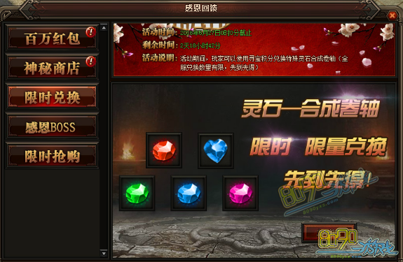 活动详情:活动期间,玩家可以使用寻宝积分兑换特殊灵石合成卷轴(全服兑换数量有限,先到先得)