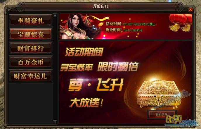 活动详情:活动期间寻宝概率限时翻倍哦,各种极品装备、道具等你来拿,更有尊·飞升大放送,千万不要错过哦~~