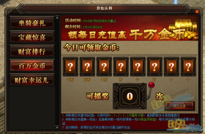 活动详情:活动期间充值领取每日充值5档奖励,分别可获得4、1、1、1、1次摇杆次数,摇杆的次数会从低到高显示,每日充值的档次后面一档都会高出前面10倍金币收益,如果一天5档的领完就可获得当天金币的最大收益,获得的金币将在每日0点通过邮件的方式发送给玩家。