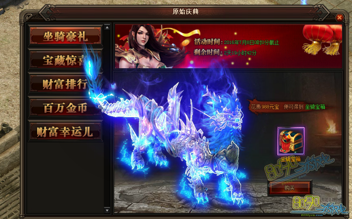 活动详情:活动期间玩家可以购买坐骑宝箱,打开坐骑宝箱会随机开出坐骑碎片,玩家可使用碎片合成完整坐骑,更有几率直接开出完整坐骑哦。