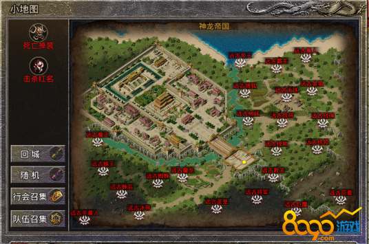 点击神龙帝国后,首先进入的是卧龙遗迹地图,刚一进入,就有一尊神龙守将等着你,只有打败神龙守将,才能真正进入跨服地图——神龙帝国。