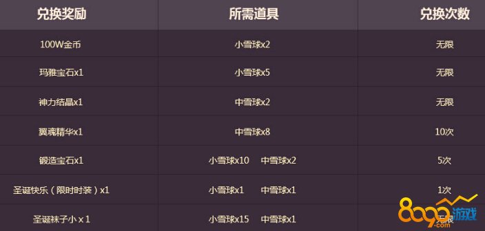 活动内容:玩家通过击杀野怪和精英怪掉落“小雪球”,通过击杀野外BOSS和黄金BOSS获得“中雪球”,玩家可将掉落的道具兑换各自所需道具。