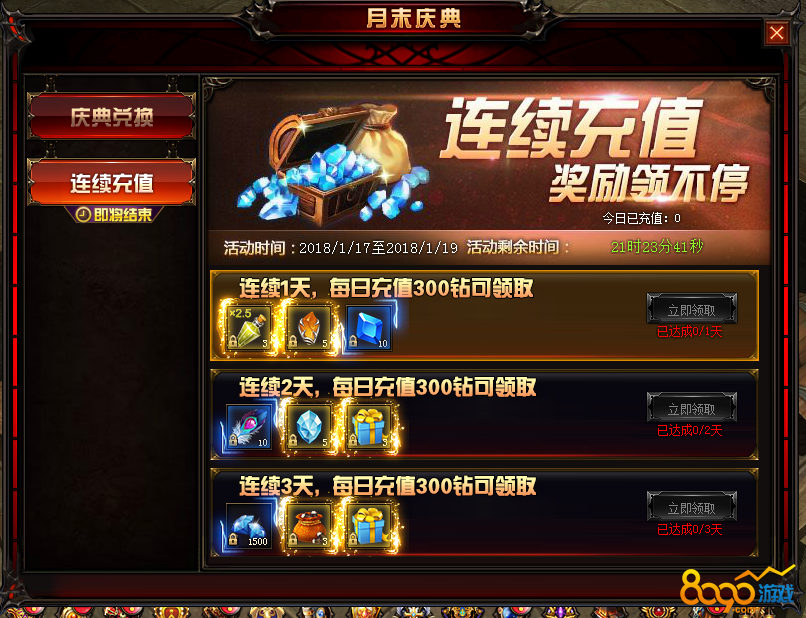 3. 活动介绍:活动时间内每天冲值300钻石,游戏豪礼送不停