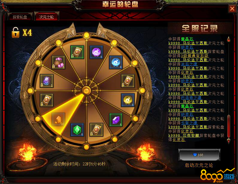 活动内容:玩家可以通过转动探索轮盘可以获得,再生宝石、3级普通宝石袋、洗练石福袋、化灵石、圣物之尘宝箱、高级魔魂、BOSS卡片(冰霜巨蛛卡)、初级炉石、1级特殊宝石袋、元素魔尘包(200)、锻造宝石、绑钻包其中之一。玩家需要转动5次才能开启次元之轮