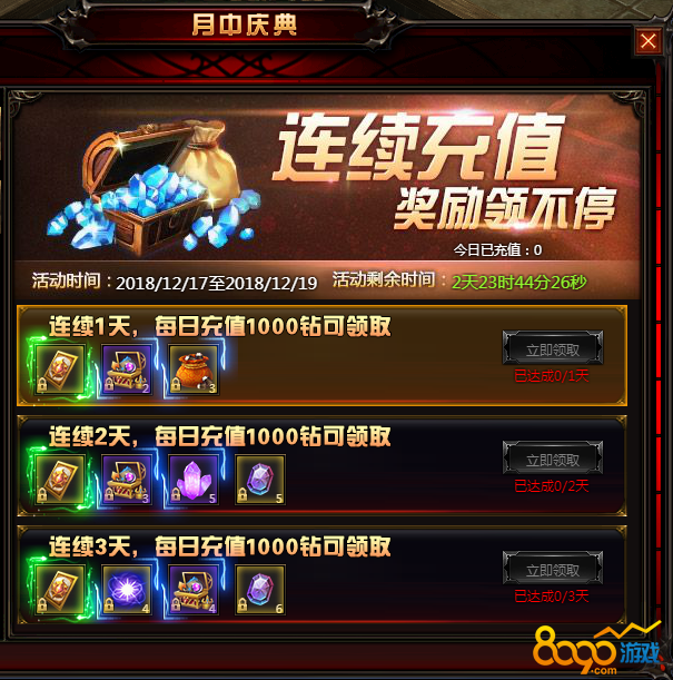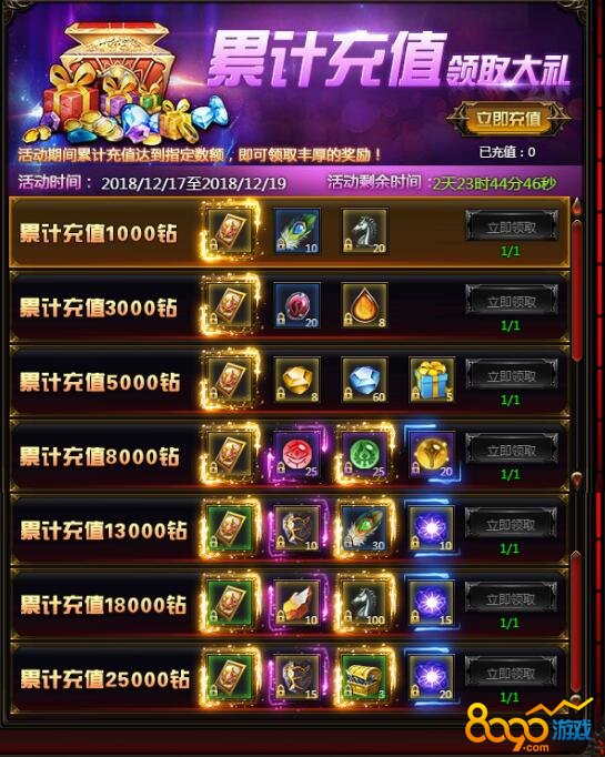活动内容:活动时间内,玩家每日充值达到1000钻,即可获得丰厚奖励,BOSS卡、圣物升级宝箱等着你!