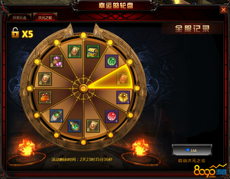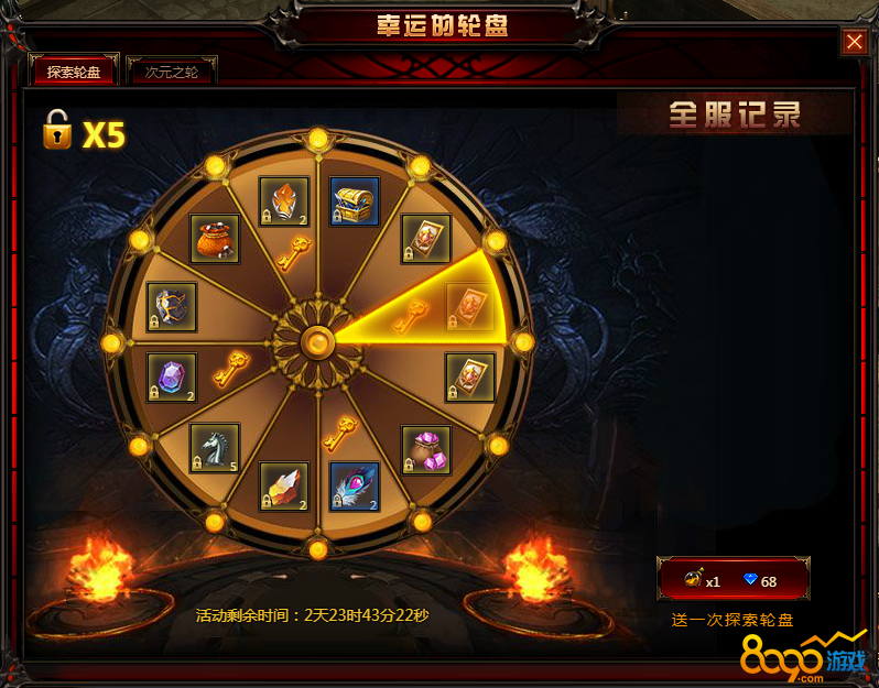 活动内容:玩家在活动时间内,使用钻石在活动页面购买探宝药水或者使用寻宝券,即可转动“探索轮盘”,探索轮盘中部分奖品含有金钥匙,获得足够多的金钥匙之后,即可自动开启次元之轮,在次元之轮页面使用钻石转动轮盘即可获得豪华礼品,在时间限制内方可转动次元之轮,倒计时结束后,次元之轮自动关闭,再次收集足够钥匙之后,方可再次开启次元之轮。