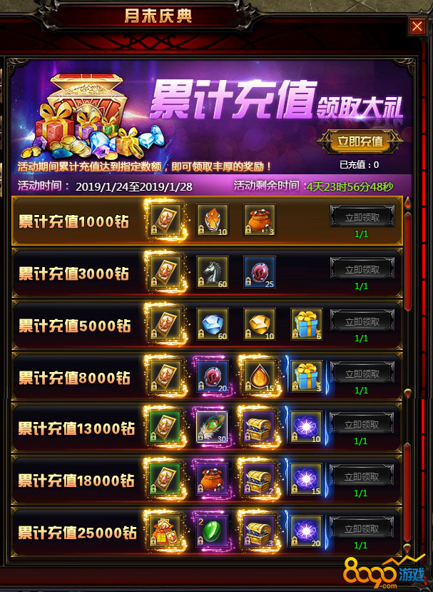 活动内容:玩家在活动时间内,累计充值达到一定钻石即可获得丰厚礼品,boss卡、紫色神灵随机箱等你来拿!